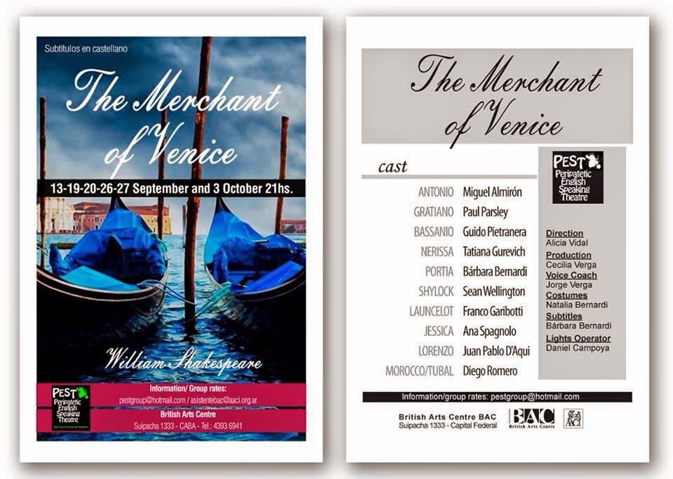 The Merchant of Venice, 19, 20, 26 and 27th of September at the British Arts Centre, 1333 Suipacha street, Ciudad de Buenos Aires, Argentina.